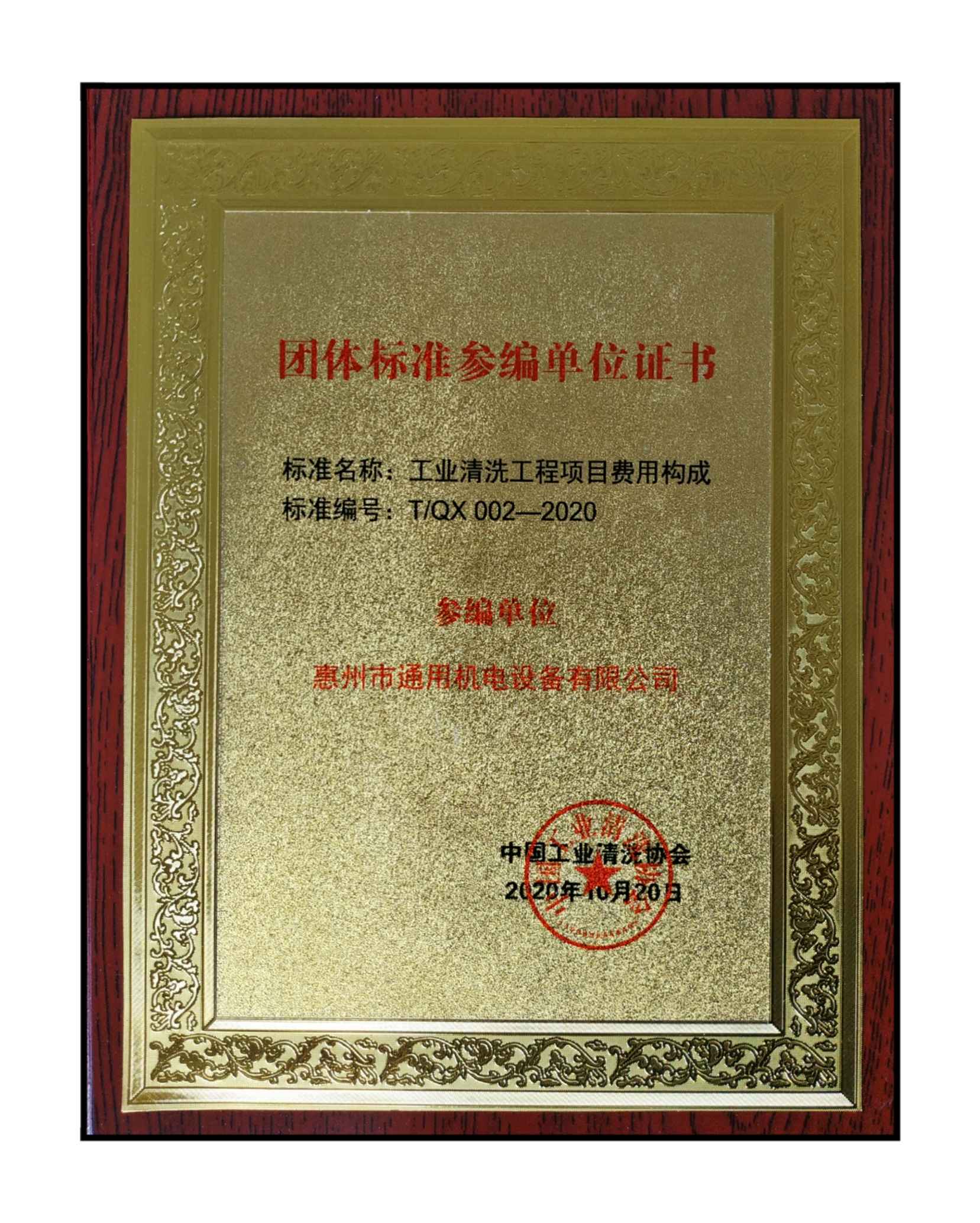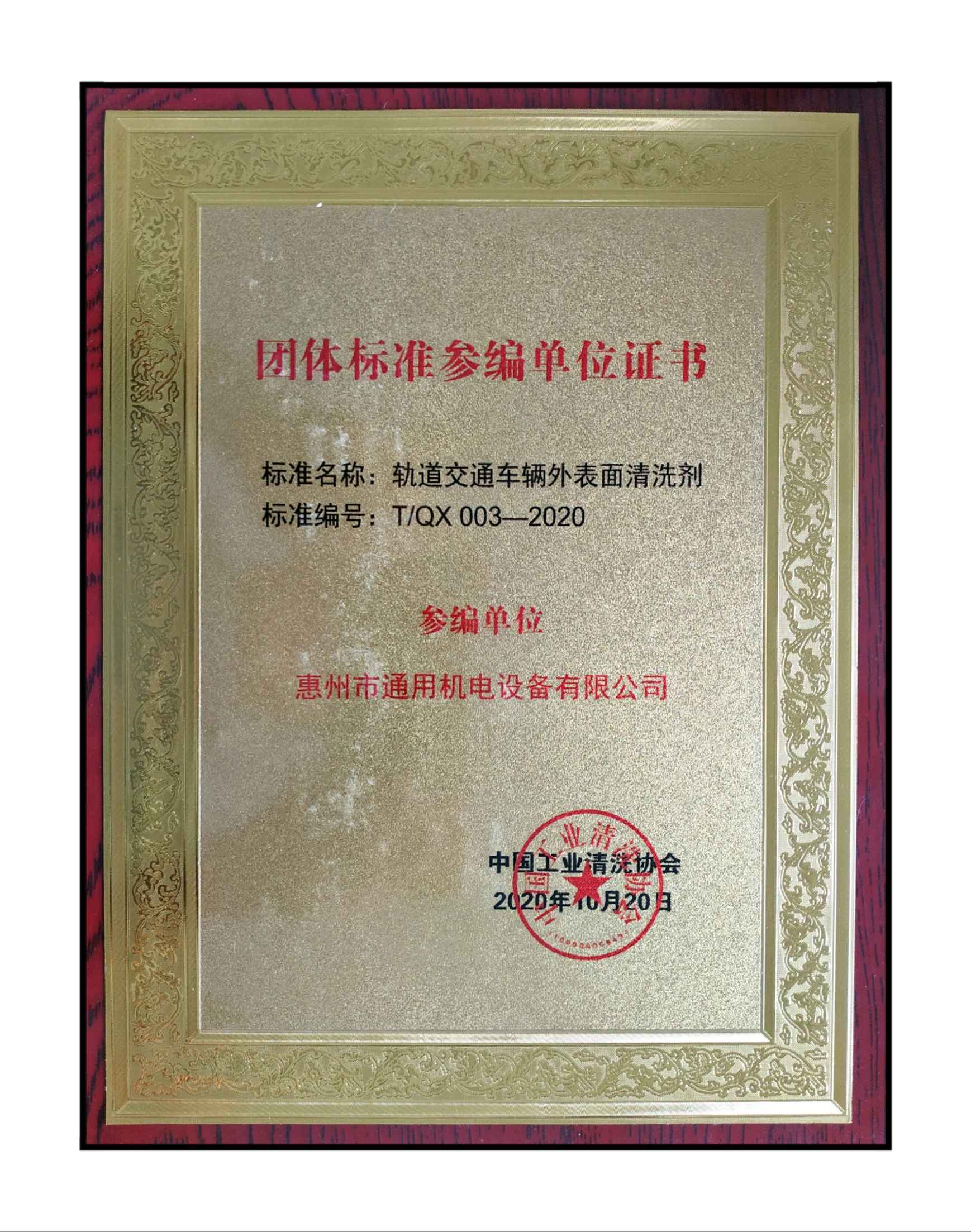 在这4项标准的编制过程中,17吃瓜 有限公司积极参与了《17c吃瓜 17吃瓜项目费用构成》和《轨道交通车辆外表面清洗剂》的编制工作,为行业标准化工作做出了重要贡献。协会也对惠州通用的积极贡献给予了高度评价及肯定,在第二十届清洗论坛的现场,协会向惠州通用颁发了荣誉证书和参编单位牌匾。
